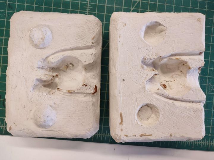 For the clay, I fashioned a full rough skull head (as seen from the unfinished side on the left) then cut it into two equal halves. I used one for the original half of the mold (left) and then detailed and reattached the other half for the second part of the mold (right).